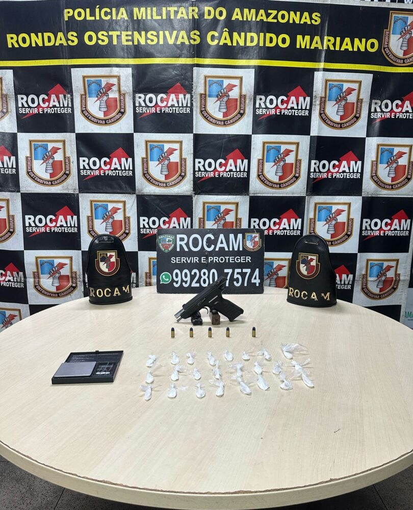 MANAUS | Uma ação da ROCAM, resultou na apreensão de drogas, munições e uma arma de fogo, na noite de sábado (10), por volta das 22h30, na rua Buriti, no bairro da União, zona Sul da capital.