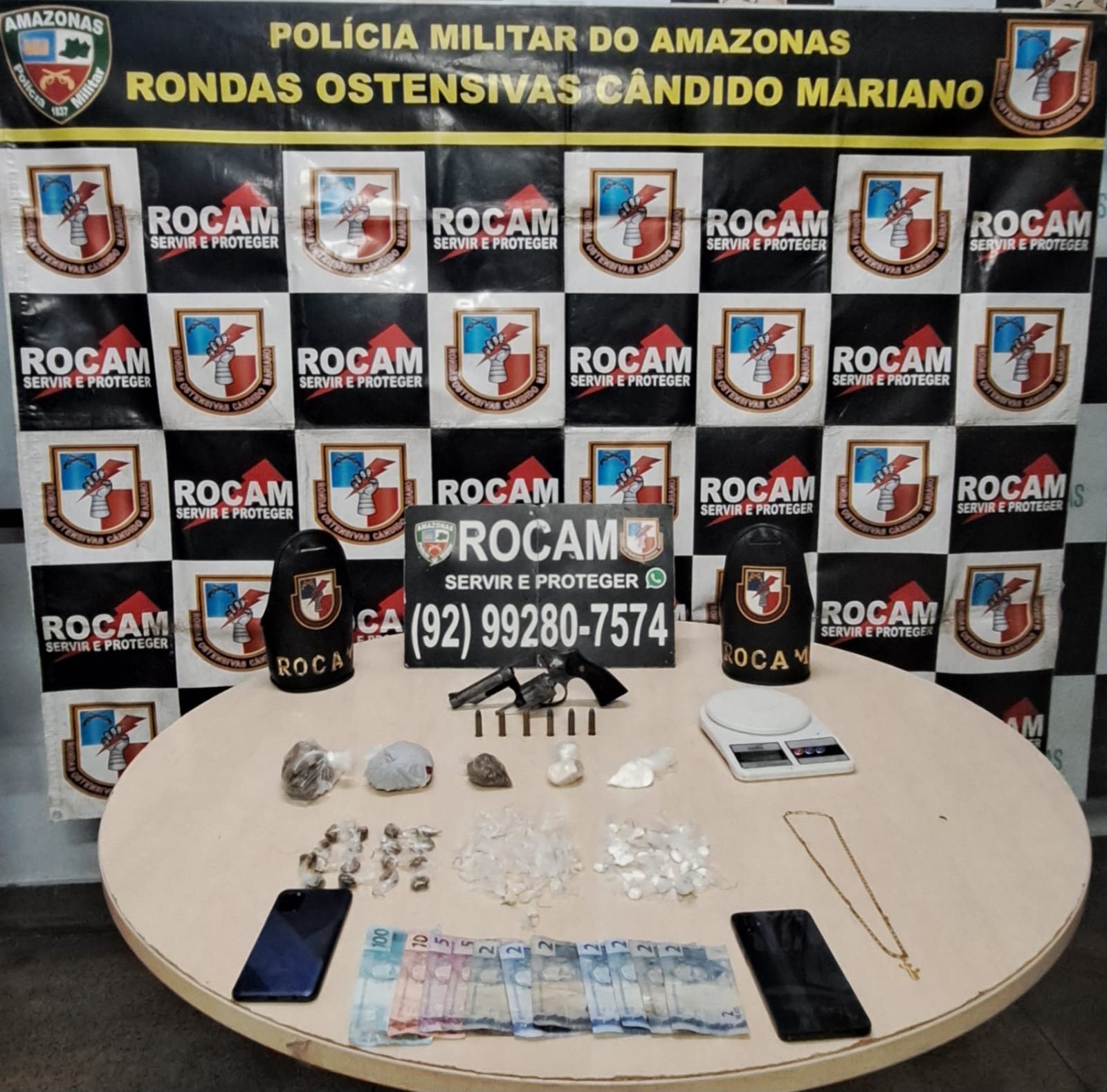 MANAUS (AM) – Um jovem de 19 anos foi preso em flagrante na tarde desta quinta-feira (4), no bairro Praça 14, zona Sul de Manaus, por porte ilegal de arma de fogo e posse de entorpecentes. A ação foi realizada pela Ronda Ostensiva Cândido Mariano (ROCAM), unidade pertencente ao Comando de Policiamento Especializado da Polícia Militar do Amazonas (PMAM).