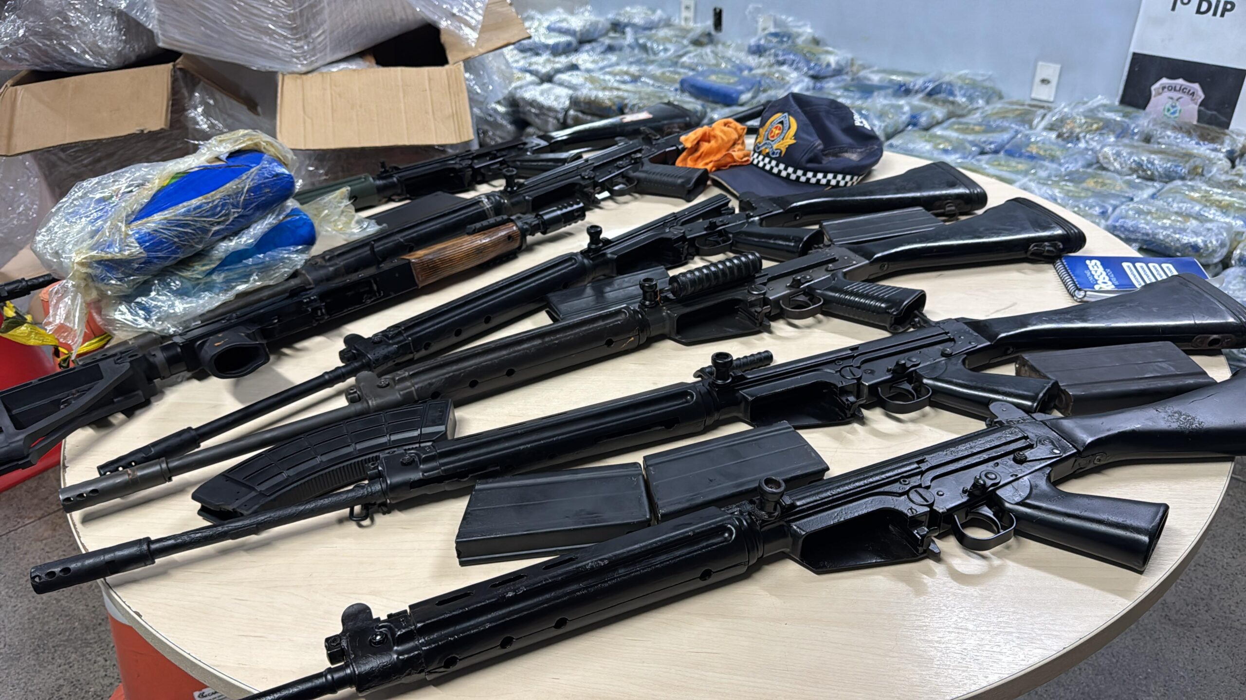Além da droga, os policiais localizaram sete fuzis de uso restrito, sendo parte do armamento do tipo Parafal. Todo o material apreendido foi apresentado no 1º DIP, onde a ocorrência foi formalizada. O entorpecente estava identificado com a marca “G3”, cuja origem será investigada.