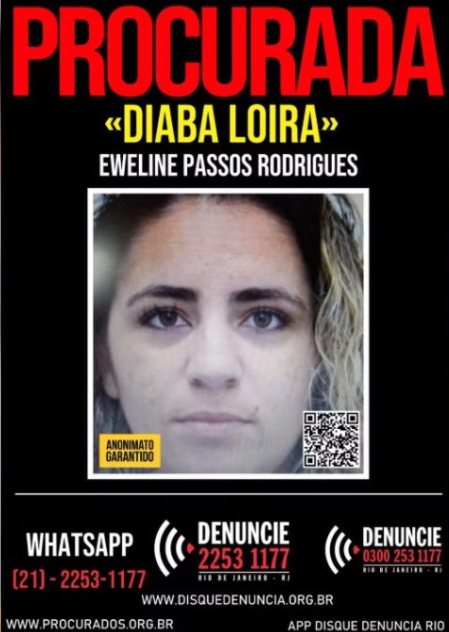 Em 2023, Eweline foi presa transportando sete quilos de cocaína. Em junho deste ano, voltou a ser alvo da polícia ao ser flagrada atirando contra agentes durante uma operação. No último dia 10 de agosto, o Disque Denúncia divulgou um cartaz solicitando informações sobre seu paradeiro.