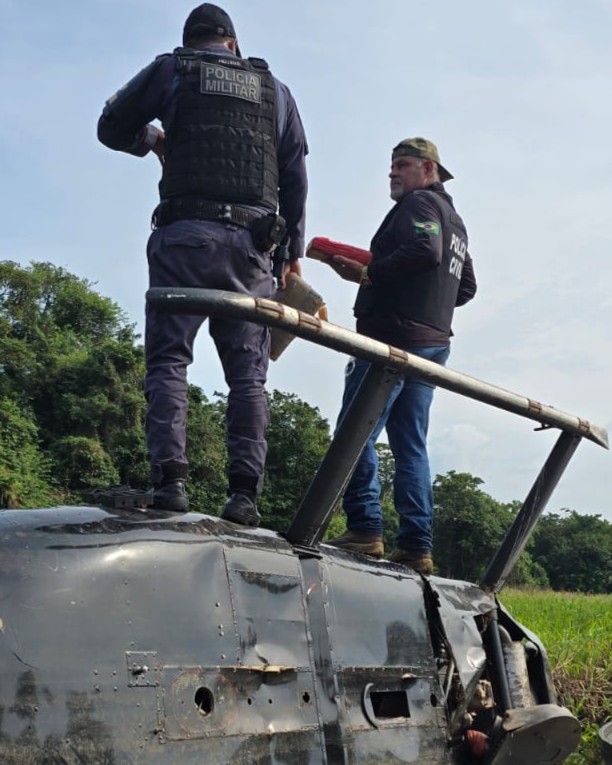 Juruá (AM) – 26/08/2025 – Um helicóptero de cor preta, modificado para o transporte de entorpecentes, foi localizado às margens de um lago no município de Juruá, distante 674 quilômetros de Manaus. A ocorrência foi registrada nesta segunda-feira (25), após denúncias anônimas. Durante a ação, as equipes encontraram dois tabletes de maconha do tipo skunk, pesando aproximadamente três quilos.