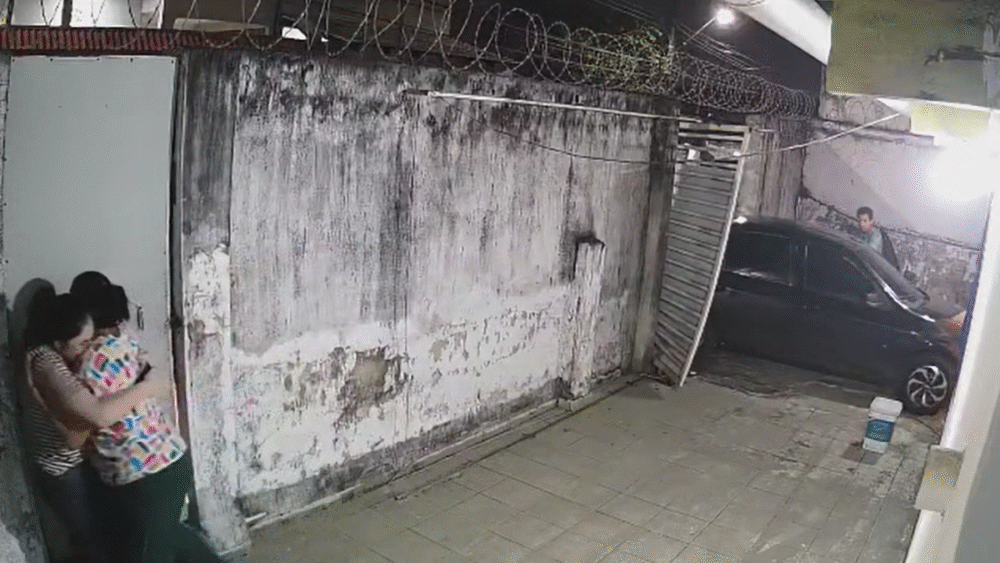 O motorista reagiu colocando o veículo em marcha à ré, quebrando o portão que já estava quase fechado e atingindo o suspeito. Mesmo caído, o homem se levantou e voltou a se aproximar do carro.