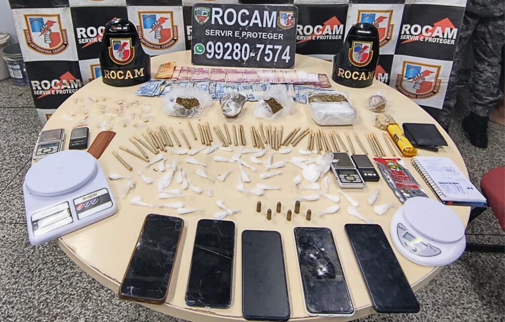 No local, os policiais apreenderam uma quantidade significativa de maconha, pequenas porções de óxido, seis balanças de precisão, cinco munições calibre 380, uma munição calibre 40 e dois simulacros de armas de fogo, utilizados em assaltos na região. De acordo com a ROCAM, a denúncia foi feita por moradores que reclamavam da onda de crimes e da presença constante de suspeitos causando insegurança na área.