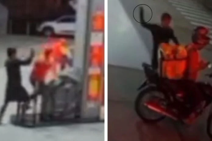 Em seguida, o agressor se desloca rapidamente até um entregador de aplicativo que aguardava alguns metros à frente, ao lado de sua motocicleta. Sem perceber o que havia acabado de acontecer, o motociclista é atacado e tenta escapar, momento em que o veículo cai no chão. Logo após a ação, o suspeito deixa o local correndo e não é mais visto nas imagens.
