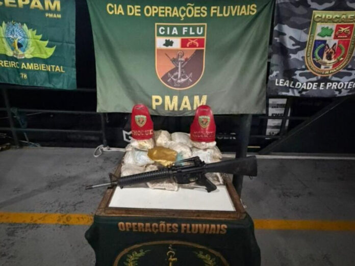 Durante a ocorrência, o suspeito indicou o ponto onde o material ilícito estava escondido. No local, os policiais apreenderam 28 tabletes de substância entorpecente, um fuzil modelo M16, uma munição calibre 5.56 não deflagrada e uma lancha adaptada com blindagem artesanal, equipada com motor Suzuki de 300 HP.