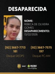 • Rebeca de Oliveira Gomes, 23 anos – desaparecida desde 13 de fevereiro, por volta das 10h30. Última vez vista na rua J, bairro Jorge Teixeira, zona leste.