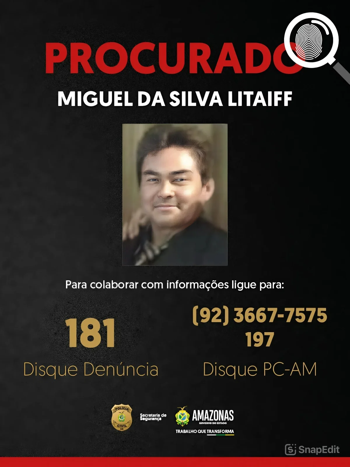 A PC-AM pede que qualquer informação sobre o paradeiro de Miguel da Silva Litaiff seja repassada pelos números 197 e (92) 3667-7575, da PC-AM; ou 181, da Secretaria de Segurança Pública do Amazonas (SSP-AM). A identidade do denunciante será preservada, garantiu a autoridade policial.