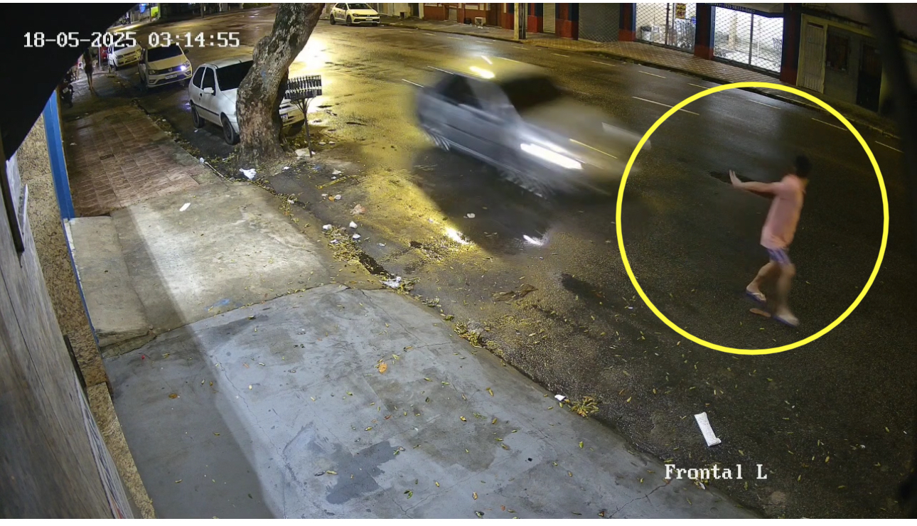 Câmeras de segurança mostram o momento em que o homem anda tranquilamente na via quando foi surpreendido por um carro em alta velocidade. O impacto o arremessou por vários metros.