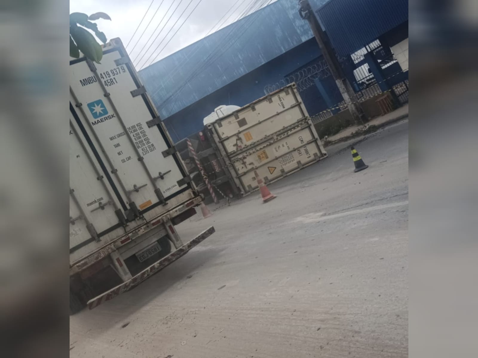 De acordo com informações do local, o veículo de carga trafegava no sentido bairro–Centro e tombou ao tentar acessar uma empresa na região. A carreta tombou para o lado direito da pista.