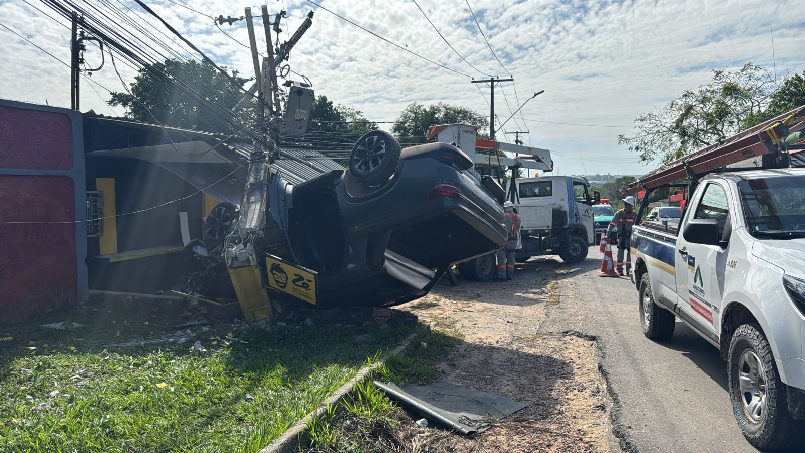 Motorista perde controle de carro, capota e atinge poste no Tarumã