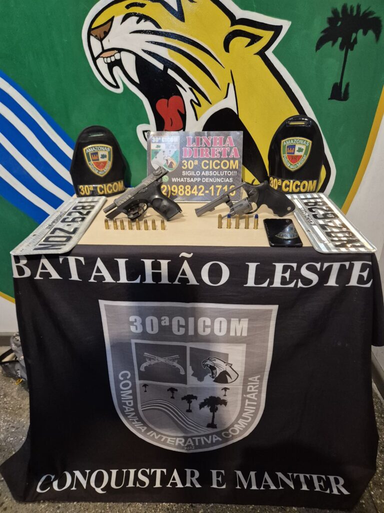Com André Souza, foi apreendida uma mochila contendo duas placas balísticas e um revólver calibre .38 com munições. O outro suspeito, identificado como Alexandro, portava uma pistola 9 mm, também com munições e carregador. Ambos foram detidos e encaminhados ao 14º Distrito Integrado de Polícia (DIP) para os procedimentos cabíveis.