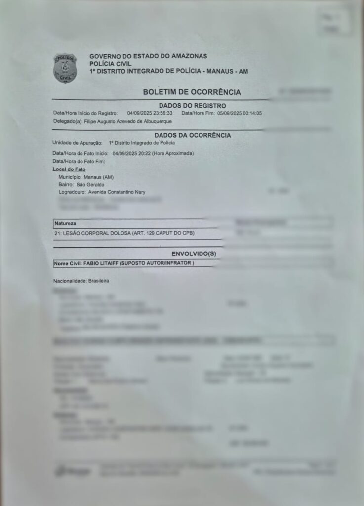 Manaus – Um menino de 8 anos foi agredido na noite de 4 de setembro em um condomínio na Avenida Constantino Nery, bairro Chapada, zona Centro-Sul de Manaus. De acordo com boletim de ocorrência registrado pela mãe da criança no 1º Distrito Integrado de Polícia (DIP), o autor da agressão foi Fábio Litaiff, de 49 anos, servidor do Tribunal de Justiça do Amazonas (TJAM). A agressão consistiu em tapas na orelha da criança, que resultaram em perfuração do tímpano.